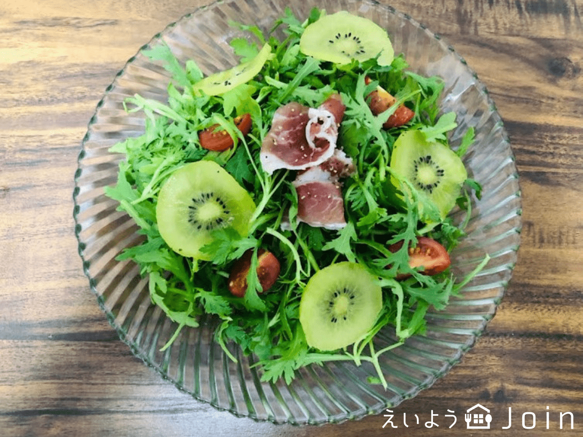 ④春菊、サンゴールドキウイ、ミニトマトと生ハムをお皿に盛り付け、3で作ったドレッシングをかけて完成。
