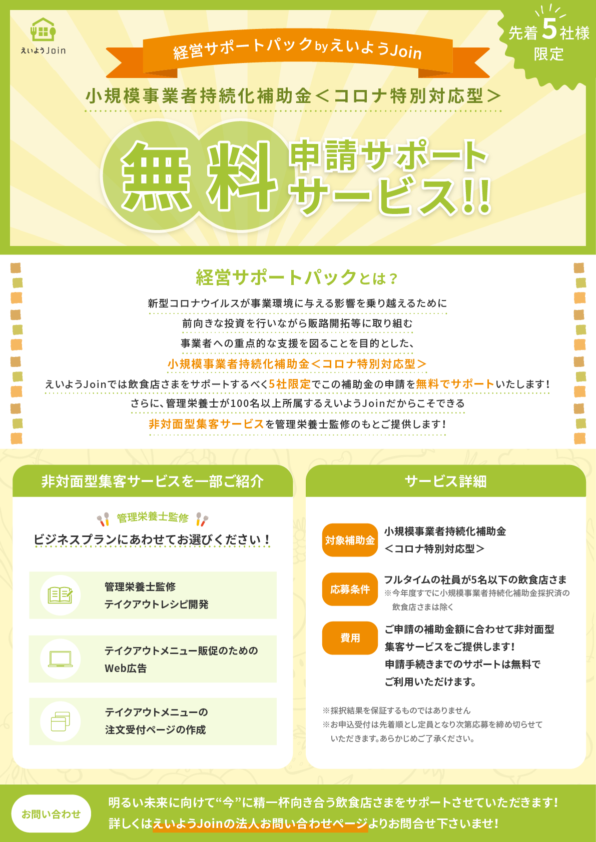 えいようJoinでは新型コロナウイルスの影響に苦しむ飲食店さまをサポートするべく、管理栄養士監修の「非対面型集客サービス」の提供と併せて、5社限定でこの補助金の申請を無料でサポートいたします!